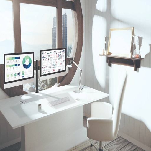 نصب گیره‌ای برای میزهای بدون سوراخ و با لبه مناسب طراحی شده و معمولاً میزهایی با ضخامت استاندارد را پوشش می‌دهد. درون جعبه معمولاً بازوها، صفحه‌های VESA، پیچ و مهره‌های لازم و آچارهای مورد نیاز وجود دارد. بسته‌بندی از نوع ضدضربه ارسال می‌شود و امکان پیگیری سفارش از طریق پشتیبانی فراهم است.